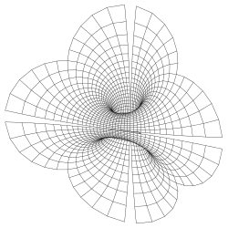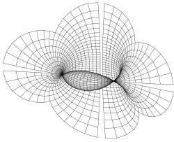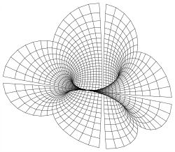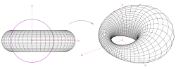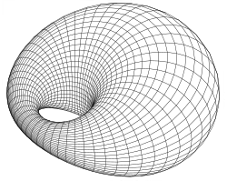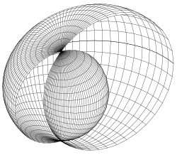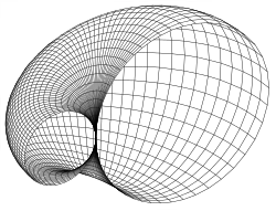 In mathematics, a Dupin cyclide or cyclide of Dupin is any geometric inversion of a standard torus, cylinder or double cone. In particular, these latter are themselves examples of Dupin cyclides. They were discovered c. 1802 by (and named after) Charles Dupin, while he was still a student at the École polytechnique following Gaspard Monge's lectures.[1] The key property of a Dupin cyclide is that it is a channel surface (envelope of a one-parameter family of spheres) in two different ways. This property means that Dupin cyclides are natural objects in Lie sphere geometry.