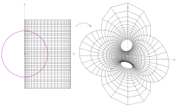 The formula of the inversion of a parametric surface (see above) provides a parametric representation of a cyclide (as inversion of a torus) with circles as parametric curves. But the points of a parametric net are not well distributed. So it is better to calculate the design parameters and to use the parametric representation above:
