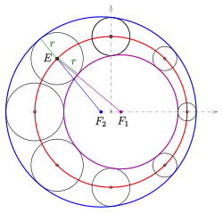 Maxwell: Property of the foci of the directrix ellipse. The ellipse is the equidistant set of the blue and purple circles.