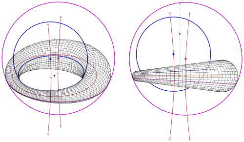 In this case the spheres touch the cyclide from outside at the second family of circles (curvature lines). To each arm of the hyperbola belongs a subfamily of circles. The spheres of one family enclose the cyclide (in diagram: purple). Spheres of the other family are touched from outside by the cyclide (blue).