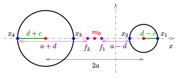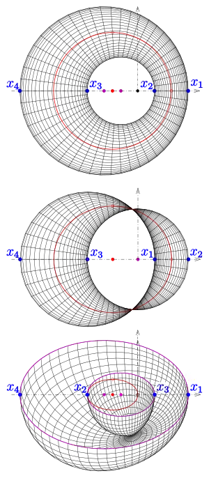 Given: A torus, which is shifted out of the standard position along the x-axis. Let be the intersections of the torus with the x-axis (see diagram). All not zero. Otherwise the inversion of the torus would not be a ring-cyclide.