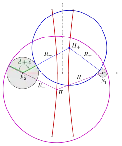 The foci of the hyperbola are . The distance of hyperbola point to the focus is and together with the sphere radius one gets . Analogously one gets . For a point on the second arm of the hyperbola one derives the equations: