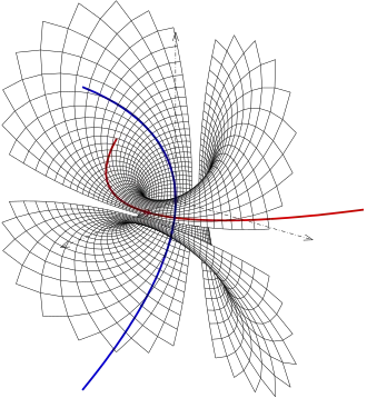 A third property which characterizes Dupin cyclides is that their curvature lines are all circles (possibly through the point at infinity). Equivalently, the curvature spheres, which are the spheres tangent to the surface with radii equal to the reciprocals of the principal curvatures at the point of tangency, are constant along the corresponding curvature lines: they are the tangent spheres containing the corresponding curvature lines as great circles. Equivalently again, both sheets of the focal surface degenerate to conics.[2] It follows that any Dupin cyclide is a channel surface (i.e., the envelope of a one-parameter family of spheres) in two different ways, and this gives another characterization.