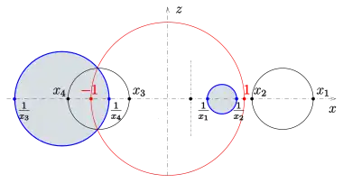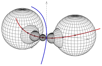 In the x-z-plane the circles of the spheres with centers and radii have the two circles (in diagram grey) with centers and radii as envelopes.