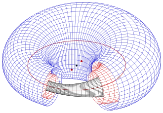 Cyclide (blue) as image by an inversion of a torus (black) at the unit sphere (red)