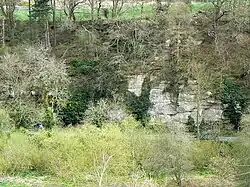 Dura Den is a small, 3 km-long wooded gorge that is located near Cupar in northeastern Fife, Scotland. This narrow cleft follows a course between the villages of Kemback to the north and Pitscottie to the south. A small stream, named the Ceres (or Kame) Burn, follows the course of this gorge and this flow includes small waterfalls near the midpoint. Historically the Ceres Burn was used to power jute spinning mills