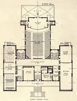 The Durango High School building was designed in the Classical Revival style,[13] intended to accommodate 500 students.[11] The building layout was based on a standard "H" shape, to which was added a wing housing the gym and auditorium, resulting in an inverted "T" shape.[9][15] At the time of construction, Durango lacked a theater or public assembly hall, so the auditorium was built with the intent that it be used by the community and school.[9]