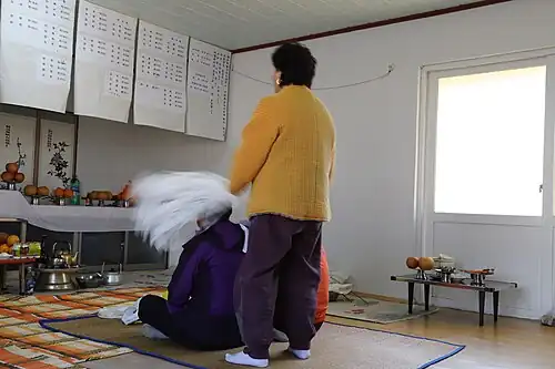 Various ritual methods are used to cure disease. If part of a child's soul has escaped, the shaman holds rituals to put it back inside the body.[6] When a malevolent force has attached to the patient, small-scale healing ceremonies may be held to detach it.[7] Sometimes, the shaman confines the patient and makes them follow certain taboos in order to be cured.[8] Large-scale rituals, or gut, are required for certain diseases such as smallpox. In these rituals, the shaman engages in active communication with the gods or ancestors that have brought on the disease and convinces or intimidates them into departing or taking mercy.[8][9]