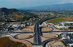 A1 Motorway represents a major northeast–southwest motorway in Albania connecting the Albanian Adriatic Sea Coast in the southwest to the Albanian Alps in the northeast. A significant part of the road network of Albania, it constitutes part of the European route E851 starting at Petrovac in Montenegro across Shkodër and Kukës to Pristina in Kosovo.[8] The opened southwestern part of the motorway around Durrës County is considered to be a segment of the Adriatic–Ionian motorway that will stretch following completion across the Balkan Peninsula from Italy in the north to Greece in the south.[9][10] In Kosovo, the A1 continues as the R7 part of the Pan-European Corridor X.[11]