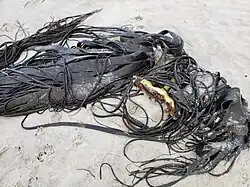 Durvillaea is a genus of large brown algae in the monotypic family Durvillaeaceae. All members of the genus are found in the southern hemisphere, including Australia, New Zealand, South America, and various subantarctic islands.[4][5] Durvillaea, commonly known as southern bull kelps, occur on rocky, wave-exposed shorelines and provide a habitat for numerous intertidal organisms.[6][7] Many species exhibit a honeycomb-like structure in their fronds that provides buoyancy, which allows individuals detached from substrates to raft alive at sea, permitting dispersal for hundreds of days over thousands of kilometres.[5][8][9] Durvillaea species have been used for clothing, tools and as a food source by many indigenous cultures throughout the South Pacific, and they continue to play a prominent role in Chilean cuisine.[5]