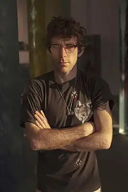Dustin Yellin (born July 22, 1975) is an American artist living in Brooklyn, New York.[1] His work embeds "hundreds of little pictures, drawings and images clipped out of magazines, art books and the like"[2] to form tableaux in miniature, which the critic Gilda Williams, writing in Artforum, noted provides viewers "the ability to occupy a divine vantage point while enjoying an overwhelming sense of discovery and wonder".[3] These works, which the artist refers to as "Frozen Cinema",[4] have been featured at sites including New York's Lincoln Center,[5] the Kennedy Center[6] in Washington, D.C, and the Brooklyn Museum, where Yellin's work is part of the permanent collection.[7] Yellin has likewise participated in The Metropolitan Museum of Art's Artist Project.[8] According to Andrew Durbin, "Yellin has formalized the central task of art—to archive: feelings, objects, events, selves—in his large glass blocks, recalling in their extreme hermeneutical diversity (forms within forms within forms, images within images within images) both as a past in which the representation of the human form was art's most recognizable enterprise and a future in which that enterprise is deeply complicated by the fact that the human form has been shredded, reformatted, revised, and redesigned, made precarious and permeable by technological and ecological shifts."[9]