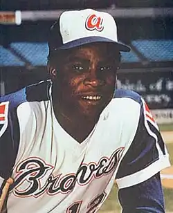 Baker made his debut as a call-up on September 7, 1968, against the Houston Astros. He went 0-for-1, and he appeared in five other games that year and collected two hits.[13] He played in the minors for most of the next three seasons, playing just 45 games for the major league Braves during that time while batting over .300 for the Triple-A Richmond Braves in 1970 and 1971. Finally, Baker made the roster for Opening Day in 1972 to get a true start to his major league career. He played in 127 games while batting .321 (third best in the National League) with 143 hits, seventeen home runs and 76 runs batted in (RBI); he received votes for Most Valuable Player, finishing 22nd.[14][15] It was during the 1970s that Baker played for the Yaquis de Obregón of the Mexican Pacific League in the offseason, stating it was the toughest league that he ever played in professionally.[16] The following year, he would play in 159 games (a career high) and batted .288 while collecting 174 hits with 101 runs, 21 home runs, and 99 runs batted in with 24 stolen bases (the latter two were career highs). He played two further seasons with the Braves, batting over .255 in each as the center fielder, but it was a moment on April 8, 1974, that earned him a place in history. On that day Baker batted fifth in the lineup behind Hank Aaron. In the fourth inning, with Baker on deck, Aaron hit a shot to left field off Al Downing for his 715th home run to pass Babe Ruth in career home runs.[17] After expressing a desire to be traded upon the closure of the 1975 season, Baker was traded along with Ed Goodson from the Braves to the Los Angeles Dodgers for Jerry Royster, Tom Paciorek, Lee Lacy and Jimmy Wynn on November 17, 1975.[18]