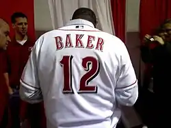 On October 13, 2007, Baker was hired as manager of the Cincinnati Reds, replacing interim manager Pete Mackanin.[63] He was the first black manager in Cincinnati Reds history; the Reds hired Baker on the heels of having fired Jerry Narron after another losing season (Baker became the fifth Reds manager since the year of 2003), with Baker being the first Reds manager hired with no prior ties to the organization since 1990.[64][65] Baker and the Reds finished 74–88 and 78–84 in 2008 and 2009, finishing 5th and 4th in the NL Central. In 2010, the Reds enjoyed success as one of baseball's breakout teams (which included first baseman Joey Votto being named Most Valuable Player of the National League), and on September 28, 2010, the Reds won the Central title. This championship led to their first playoff appearance in 15 years.[66] However, the appearance was short-lived as the Reds were swept by the Philadelphia Phillies in the NLDS. Baker signed a two-year contract extension with the Reds on October 4, 2010.[67]