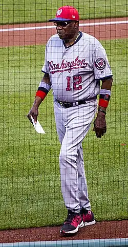 After retiring as a player, Baker served as the manager of the Giants from 1993 to 2002, the Chicago Cubs from 2003 to 2006, the Cincinnati Reds from 2008 to 2013, the Washington Nationals from 2016 to 2017, and the Houston Astros from 2020 to 2023. Baker was named NL Manager of the Year three times with the Giants and won the 2022 World Series with the Astros. He was also the first MLB manager to reach the playoffs and win a division title with five different teams, having accomplished both feats with each team he managed. Baker ranks seventh in MLB managerial wins and has the most wins among African American managers. Following his retirement as a manager, Baker joined the Giants' front office.[4] Baker was named the manager of Team Nicaragua for the 2026 World Baseball Classic, slated to take place in Miami in March 2026.