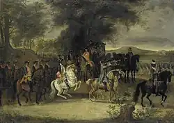 After his death in 1702 the Regents again declined to appoint a new stadtholder (and the Second Stadtholderless Period began), but their natural inclination to again curtail the army had to be postponed till after the end of the War of the Spanish Succession. But then history repeated itself: the army was reduced in size to the absolute minimum that could still be considered safe. Because at the same time the Republic abdicated its pretensions to the status of a Great Power and embarked on a policy of neutrality, and to the fact that the Republic's hereditary enemies Spain and France for different reasons temporarily did not pose the usual threats to the Republic's existence, this did only lead to disaster in the course of the War of the Austrian Succession into which the Republic was dragged against its will due to its line of barrier fortresses in the Austrian Netherlands that made its neutrality impossible once France invaded that country. (These barrier fortresses were established after the Peace of Ryswick and reconfirmed by the Barrier Treaties of 1709–15. They allowed the Republic a sense of safety at relatively low expense, and provided the main function for the States Army during most of the 18th century:garrisoning the fortresses). The neglect of the army then exacted its toll and, as in 1672, the inevitable defeats the States Army sustained led to a popular revolution that once again brought a member of the House of Orange-Nassau to dictatorial power, this time William IV in 1747. William IV was no William III however, and besides he soon after died. The positive results of the revolution of 1672 were therefore not repeated, neither in the political field, nor the military. The Republic and its army remained on their downward course till the demise of the old Republic at the hands of the French in 1795. This was only punctuated by the Anglo-Prussian intervention on the side of stadtholder William V in 1787 (the States Army did not play a role in the Seven Years' War, because the Republic again managed to remain neutral, and the Fourth Anglo-Dutch War, because that, like the First and Second Anglo-Dutch War were exclusively naval conflicts). The swan song of the States Army was the Flanders Campaign of 1793–1795, during which it played an often unappreciated role. The establishment of the army was increased from 45,000 in 1792 to 60,000 in 1793[69] A veldleger (mobile army) was formed under the command of the Hereditary Prince that was sometimes successful (Siege of Landrecies (1794)), sometimes woefully unsuccessful (Battle of Menin (1793)). It all ended with the collapse of the armies of the First Coalition in January, 1795.[70] Because the 18th century therefore remained rather dismally uneventful the interest of (Dutch) historians for the history of the States Army in that century has been limited. The standard works cited below all limit themselves to the period before 1715.