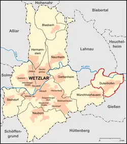 Dutenhofen was an independent municipality until January 1, 1976, when it became a suburb of the city of Lahn. On August 1, 1979, Dutenhofen became a borough of Wetzlar.[1]