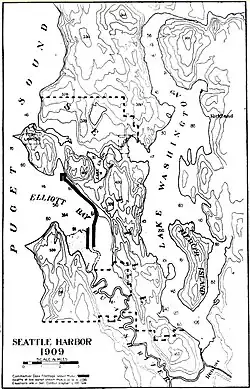 In 1895, Eugene Semple, who had earlier served as Governor of Washington Territory, outlined a plan for a series of major public works projects in the Seattle area, including the straightening and dredging of the Duwamish River, both to open up the area to commercial use and to alleviate flooding. In 1909 the City of Seattle formed the Duwamish Waterway Commission to sell bonds and oversee the re-channelling of the river. Work began in October 1913, and the oxbows gradually disappeared, with a few recesses in the channel left to accommodate high water flows and turning ships. Parts of the Georgetown and South Park neighborhoods once on quiet riverbank found themselves inland; the Georgetown Steam Plant was now almost a mile from the river, and special water pumping facilities had to be installed. By 1920, 4½ miles of the Duwamish Waterway had been dredged to a depth of 50 feet, with 20 million cubic feet of mud and sand going into the expansion of Harbor Island.[8] The shallow, meandering, nine-mile-long river became a five-mile engineered waterway capable of handling ocean-going vessels.[9]