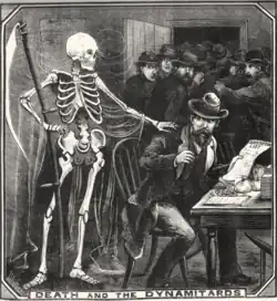 First appearing in English language newspapers in 1882,[1][2][3] the word was understood to be a French expression applied to political terrorists in France.[4] In reality, dynamitard is not a formal French word; French newspapers had conjured it up as a disdainful variant of dynamiteur.[5] It was soon applied to Harry or Henry Burton and James Gilbert Cunningham,[6] Irish-Americans who were charged with high treason and felony at Bow Street Police Court in 1885 for planting explosives in London and elsewhere.[4][7][8] "A term of opprobrium for some and endearment for others, the dynamitard was technically a political dynamiter, of the kind that bombed railway carriages and exploded devices in the House of Commons in the name of Irish freedom, chiefly in the early 1880s."[9]