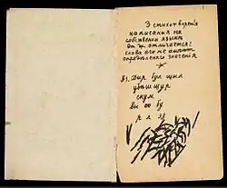 The poem was written in December 1912. This date the author then called "the time of occurrence of the phenomenon of Zaum language (i.e. the language that has no utility value), in which are written the whole independent works, and not just parts thereof (as the chorus, sound decoration, etc.)".[3] Initiator of the creation of the work of the "unknown words" was David Burliuk.[4] "Dyr bul shchyl" was published in January 1913 in a series of "three poems" in Kruchenykh's book Pomada[5] (English: Pomade). According to Kruchenykh, this poem was to become much more known than him.[6] Prefacing the poems, he also stated that "its words do not have/a definite meaning".[7]