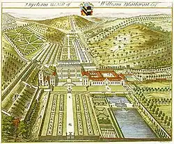 In 1689, the estate was acquired through marriage by William Blathwayt, who was Secretary at War to William III. He retained the existing Tudor building and expanded it in stages.[5] The west front of 1692 was commissioned from Huguenot architect Samuel Hauduroy,[6] and includes an Italianate double staircase leading from the terrace to the grounds.[7] In 1698, a stable block was added with space for 26 horses and servants' quarters above around a courtyard.[5] The east front of 1704 was designed by William Talman, architect of Chatsworth.[6] The construction of the east wing included demolition of the remains of the original Tudor house and the addition of a statue of an eagle on the roof.[5]
