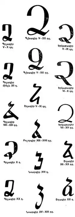 Dza (Eastern) or Tsa (Western) (majuscule: Ձ; minuscule: ձ; Armenian: ձա) is the seventeenth letter of the Armenian alphabet. It represents the voiced alveolar affricate (/d͡z/) in Eastern and the voiceless aspirated alveolar affricate (/t͡sʰ/) Western varieties of Armenian. Created by Mesrop Mashtots in the 5th century, it has a numerical value of 80.[1] Its shape in capital form similar to the Arabic numeral 2.