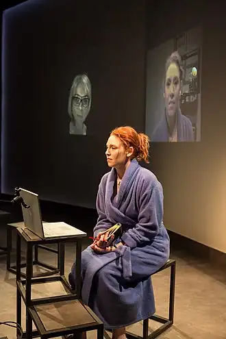 Scenes take place either in person in New York, or through electronic media (Skype, text messages, phone calls) with Catherine in London and Nellie in Massachusetts. In one production, this was achieved by having the two actors on stage, sitting at computers and looking into tripod-mounted video cameras, with the images being projected onto the wall behind the stage (illustrated at left). These enlarged images provide "magnified clarities for the audience to engage and learn from"[2] and was described as an ingenious production approach as it has the effect of "[a]mplifying emotional moments for the audience" by allowing the audience "to see close-ups of their faces and be a fly on the wall for tough conversations".[6] The reviewer for Stage Whispers expressed concerns that this use of projections and technology-facilitated communications would be a distraction, but praised its simple execution as seeming "entirely natural" and as adding to the experience by achieving a closeness to the actors that is rare, even in very intimate theatres.[4]