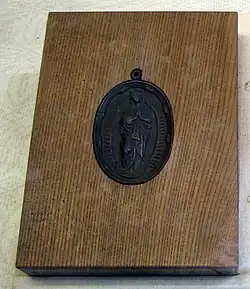 Fumi-e were usually cast from bronze, but others were made of painted stone and some were woodblock prints. There are relatively few surviving fumi-e,[7] as most were simply thrown away or recycled for other uses. Some examples were displayed by the Smithsonian in their 2007 exhibition "Encompassing the Globe: Portugal and the World in the 16th and 17th Centuries."[13][14] One example is on display at the Christian Museum in Nagoya ( 切支丹遺跡博物館 )