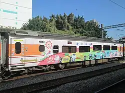 At the time of the units' arrival, trains were popular since they were first to use a streamlined design, contrasting with the boxy design of its predecessor.[5] However, the TRA soon reported that the trains suffered from frequent traction motor failures and insufficient power delivery due to poor maintenance, oftentimes requiring a third locomotive to be attached to the rear as a backup. Due to the poor quality of stainless-steel painting processes at the time of production, the coaches were also not painted, but rather had stickers applied, which began to fade, mottle, and peel after exposure to weather and sunshine in service. The multitude of problems plaguing the class earned them the derisive nickname "Beggar Gang Train" among enthusiasts and the press.[2][6] The poor state of repair, combined with paying-off of the maintenance contract's performance bond following Hyundai's merger with Rotem, and subsequent withdrawal of support staff from Taiwan in 2003, prompted TRA to sue the company in 2005 for $1.7 billion NTD in damages;[7] however, the lawsuit never came to fruition. Nevertheless, in response, Minister of Transportation and Communications Lin Ling-san banned South Korean companies from participating in future transportation bids until problems with the E1000 and other South Korean-produced equipment are resolved.[4] The two reached an agreement of $300 million NTD in 2018.[7][8]