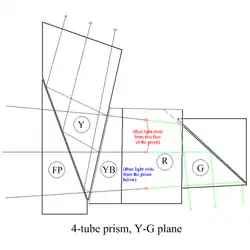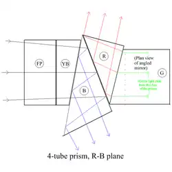 In an early configuration of the prism block, shown in the thumbnail, three of the pick-up tubes were envisaged to be in a common plane, but with the fourth (red) tube sticking up, nearly at right angles to the other three. (This configuration was to be used in the Russian four-tube camera type KT-116M.[4])
