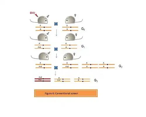 ENU is used as a genetic tool by designing a variety of genetic screens suitable to the researchers' interests. Depending on the region being assessed, forward genetic screens can be classified as illustrated in Figure 2 as:[8]