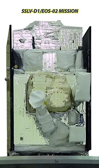 EOS-02 (formerly known as Microsat-2A) was an Indian Earth observation microsatellite developed by the Indian Space Research Organisation as a test payload on the maiden launch of the Small Satellite Launch Vehicle (SSLV).[1] EOS-02 was based on Microsat-TD. The objective behind EOS-02 was to realize and fly an experimental imaging satellite with short turnaround time to showcase launch on demand capability.[2]
