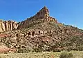 Eph Hanks Tower is a 6,540-foot (1,990-meter) elevation summit located in Capitol Reef National Park, in Wayne County of Utah, United States.[2] This landmark is situated 8 mi (13 km) southeast of the park's visitor center, 3.5 mi (5.6 km) south-southeast of Ferns Nipple, and 1.4 mi (2.3 km) south-southwest of Golden Throne, at the mouth of Capitol Gorge where the Capitol Reef Scenic Drive road ends. It towers 900 feet above the picnic area below its north aspect. Precipitation runoff from this feature is drained by Capitol Wash and Pleasant Creek, a tributary of the Fremont River, which in turn is within the Colorado River drainage basin. This geological feature is named after Ephraim Knowlton Hanks (1826–1896), a Mormon pioneer and first permanent settler in the Capitol Reef area, who with his family homesteaded in the Pleasant Creek area of Capitol Reef in 1881.[3] Ephraim Hanks' Floral Ranch on Pleasant Creek supposedly offered a safe retreat for polygamists along the Mormon underground railroad.[3]