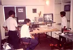 The original ETV (digital) studio: (L to R) Arlaka Jayasekara [11] (Admin Manager MSC/ETV), Sanjay B. (Entrepreneur from India), Priyanke (Anthonus) (CEO/MD MCS & Director/Technology consultant ETV) on the 17th floor of the SET building in Colombo 4, Sri Lanka. Incidentally, the TV shows (BBC NEWS item) an image of Soviet leader Mikhail Gorbachev which caught the attention of Sanjay B.