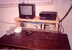 ETV microwave transmitter at 'East-West Properties' at Peliyagoda, Sri Lanka in (under) the 50 ft (15 m) concrete dish. The transmitter was broken into two parts with the head-end on the transmitting tower (antenna) on Priyanke's advice.