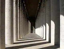 The most representative building at EUR, and the symbol of this architectural style, is the Palazzo della Civiltà Italiana (1938–1943), an iconic project which has since become known as the "Colosseo Quadrato" (Square Colosseum). The building was designed by Giovanni Guerrini, Ernesto Lapadula and Mario Romano, also inspired by metaphysical art.