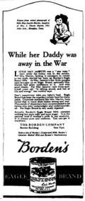 Newspaper ad for Eagle Brand milk from 1922, describing how the child was raised on the milk while her father was away in World War One