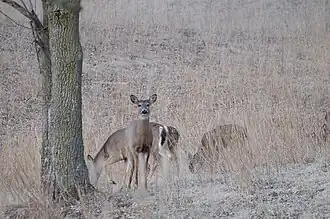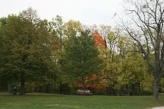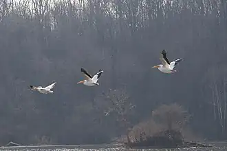 Clockwise from upper left: The park in October 2009, American white pelicans flying at the park's bird sanctuary, deer grazing in the park, a picnic shelter and directional sign, and a lakeside trail. |