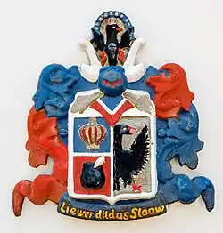 Eala Frya Fresena (East Frisian Low Saxon IPA: [ˈeːla ˈfrɪja ˈfreːzəna]) is the motto for the coat of arms of East Frisia in northern Germany. The motto is often mistranslated as "Hail, free Frisians!", but it was the reversal of the feudal prostration and is better translated as "Stand up, free Frisians!".[1] According to 16th-century sources, it was spoken at the Upstalsboom in Aurich where Frisian judges met on Pentecost and it is traditionally answered with Lever dood as Slaav, or in English, rather dead than slaves.[2]
