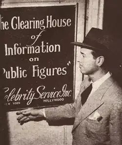 After a brief career in Hollywood in 1932 as an actor, he moved to New York City, where Aries is Rising, a musical comedy he wrote in 1937,[3] starring Constance Collier, had a brief run at the John Golden Theater.[2] While in New York, he founded Celebrity Service, with fellow writer, Boston native Ted Strong,[3] in 1939.[1] They were based on East 54th Street, next door to the El Morocco nightclub, which was at number 154.[3]