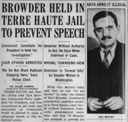 After 1935 the Communist Party maintained only nominal opposition to the Roosevelt administration, with Browder heading the party's 1936 ticket as its candidate for president in the election of 1936. At a campaign stop in Terre Haute, Indiana on September 30, 1936, he and other party officials were arrested for attempting to hold a rally. They were released the next day.[26] He received 80,195 votes. In practice, progressives of both parties were seen as key constituents in a broad "People's Front" against fascism and a bulwark of the movement for collective security in Europe against German aggression. The Communist Party attenuated its message of the historical inevitability of revolution, emphasizing progressive trends in American history and attempting to cast itself as an indigenous reform movement under the slogan "Communism is 20th Century Americanism".[27] The stark phraseology of Marxism, based upon the inevitability of class struggle, was replaced by a fuzzy critique of capitalism using Rooseveltian terms like "economic royalism".[27]
