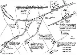 In 1857 the branch to the Caprington Colliery No.40 pit had yet to be built. A building to the east of the railway at the junction to the sawmill is suggestive of a signal box but is later marked as a water meter. The railway continued towards Blacksyke Tower and to several other pits in the area at this time, the line being standard gauge and worked by locomotives by this date.[10]