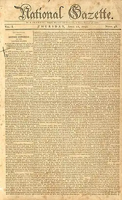 On the anti-Federalist side, Philip Freneau was a strong voice through his newspaper, the National Gazette, which he established in 1791, during President Washington's first term. Freneau was encouraged by James Madison and the Secretary of State, Thomas Jefferson, to establish what became a partisan newspaper, to counter Federalist leaning newspapers. Since Jefferson had hired Freneau as a French translator at the Department of State it was assumed by various Federalists that Jefferson had played a role in authoring the political attacks made on Washington and his federalist colleagues in Freneau's Gazette, which Jefferson denied.[188] Washington generally paid little mind to the litany of political machinations occurring in newspapers, however, he privately asked Jefferson for Freneau's removal from the State Department. Jefferson insisted that Freneau and his paper were sparing the country from turning into a virtual monarchy and managed to convince Washington to forgo his removal on the grounds that it would amount to an affront to Freedom of the Press, and would ultimately prove damaging to Washington and his administration.[189] Both Fenno and Freneau became major figures in the history of American newspapers during the post revolution years and played leading roles in shaping the beginnings of party politics beginning in the 1790s.[187]