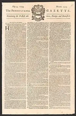 The Pennsylvania Chronicle, published by William Goddard, whose first edition was published on January 6, 1767, was the fourth newspaper to be printed in the English language established in Philadelphia, and the first newspaper in the northern colonies to have four columns to a page.[68]