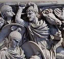 Warfare seems to have been a constant in Germanic society, and archaeology indicates this was the case prior to the arrival of the Romans in the 1st century BC.[1] Wars were frequent between and within the individual Germanic peoples.[2] The early Germanic languages preserve various words for "war", and they did not necessarily clearly differentiate between warfare and other forms of violent interaction.[3] The Romans note that for the Germans, robbery in warfare was not shameful. Consequently the motivations for Germanic warfare both against Rome and against other Germanic peoples was the potential to acquire booty.[4][5]