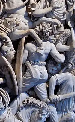 Germanic armies were probably not large, with numbers such as an army of 100,000 Suevi claimed by Caesar being literary and propagandistic exaggerations.[19] Scholars can extrapolate numbers from 500–600 to 1600 per war band from later sources.[20] Older scholarship sometimes supposed that all the men in a "tribe" formed the army, but this would have been logistically impossible in a premodern society.[21] Steuer, while noting Germanic victories against large Roman forces, estimates the typical war band to have been no larger than 3000 men, while estimating that only as many of 1,800 may have participated in a campaign.[22] In later times, as the population of Germania grew, the armies grew larger.[23] Most warriors were probably unmarried men. Tacitus and Ammianus Marcellinus (4th century CE) indicate that armies included both young men and older, more experienced warriors.[21] By the early Middle Ages, armies were mostly composed of a distinct warrior class that relied on peasants for support.[24]