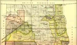 The areas combined indicates a reserve for the Chippewa (Turtle Mountain band) established on December 21, 1882, by executive order.[1]: 908–909 Two years later the major part of it was relinquished by executive order of March 29, 1884.[1]: 916–917 The diminished reserve for the Turtle Mountain Chippewa is shown as two yellow survey townships. Within three months, the "President amends Executive order of Mar. 29, 1884" with its far from practical division of the reserve. The executive order of June 3, 1884, made the reserve a whole (the southern half of the reserve was moved one survey township westward – not shown on the map).[1]: 916–917