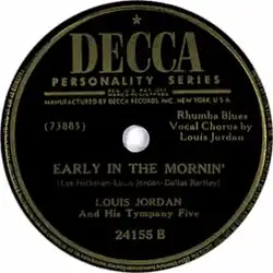 "Early in the Mornin'" or "'Early in the Morning" is a song that was recorded by Louis Jordan and His Tympany Five in 1947. It is an early example of a blues which incorporates Afro-Cuban rhythms and percussive instruments.[1] "Early in the Mornin'" became a hit, reaching number three in Billboard magazine's race records chart.[2]