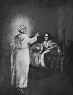 Smith's parents also experienced visions. Before Joseph was born, his mother Lucy, prayed in a grove about her husband's refusal to attend church and later said she had had a dream-vision, which she interpreted as a prophecy that Joseph Sr. would later accept the "pure and undefiled Gospel of the Son of God."[32] According to Lucy, Joseph Smith Sr. also had seven visions between 1811 and 1819, coming at a time when he was "much excited upon the subject of religion." These visions confirmed in his mind the correctness of his refusal to join any organized church and led him to believe that he would be directed in the proper path toward salvation.[33] Lucy's account, recorded thirty years after the period in which the visions are said to have occurred, suggests "a tendency to make her husband the predecessor of her son" by echoing passages in the Book of Mormon.[34]