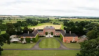 The outside of the house includes a walled garden as part of a wider area of parkland,[7] with substantial gatepiers at the entrance to the drive.[8] There was also an attached farm with a brick barn.[9] In the surrounding woodland was a four-pipe duck decoy with nine shooting positions.[10]