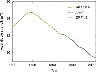 The direction and intensity of the dipole change over time. Over the last two centuries the dipole strength has been decreasing at a rate of about 6.3% per century.[13] At this rate of decrease, the field would be negligible in about 1600 years.[35] However, this strength is about average for the last 7 thousand years, and the current rate of change is not unusual.[36]